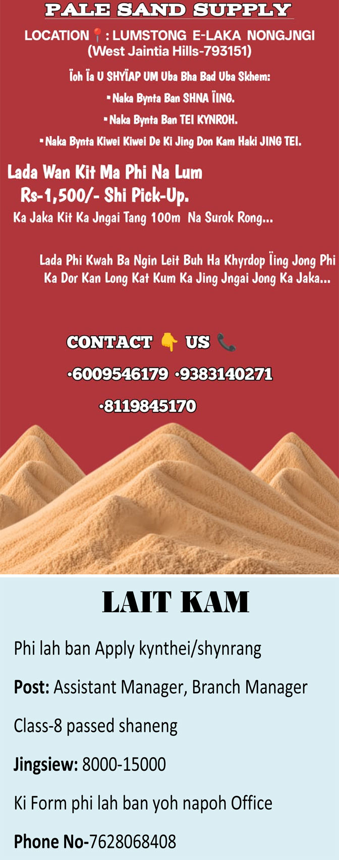 Ka seiñ da ong ko wa kamwa man katni, ka Jowai man ko kawa le hei heh na ki sor ha jylla wei man ko kawa khooid wei kawa chongsuk chongsaiñ tangwa la ar le snem kattu ki paidbah da chem chitom bha ki neidaw wa sih ware u sarok.