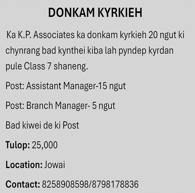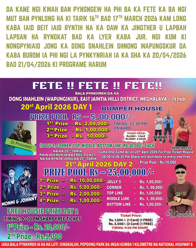 Sa iwi wa da jia toh ynne i miet heipor 7:00 waje haroh heiwa kawi ka kari wa pynyieñ ha rood sarok ha Chutwakhu, Jowai leh da jia i jooh wa chah tooh Battery wei heini i por ki bru wa lai wa wan leh dang boon ki.